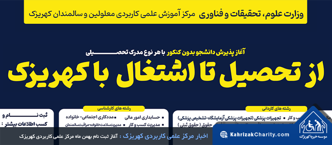 مرکز آموزش علمی کاربردی کهریزک بدون برگزاری کنکور، در دو مقطع کاردانی و کارشناسی ویژه بهمن ماه 1404 دانشجو...